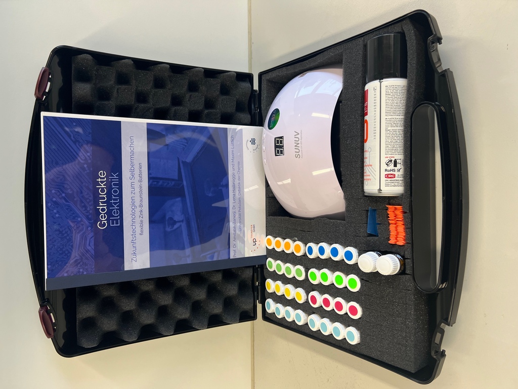 Wir konnten die Materialien in einem Lehr-Lern-Koffer zusammenstellen (s. Abbildung unten), mit dem es möglich ist, gedruckte Elektronik auch im Schullabor mit Schüler*innen umzusetzen. Der Koffer wird aktuell mit ausgewählten Lehrkräften erprobt und ist ab sofort im online-Shop erhältlich.
